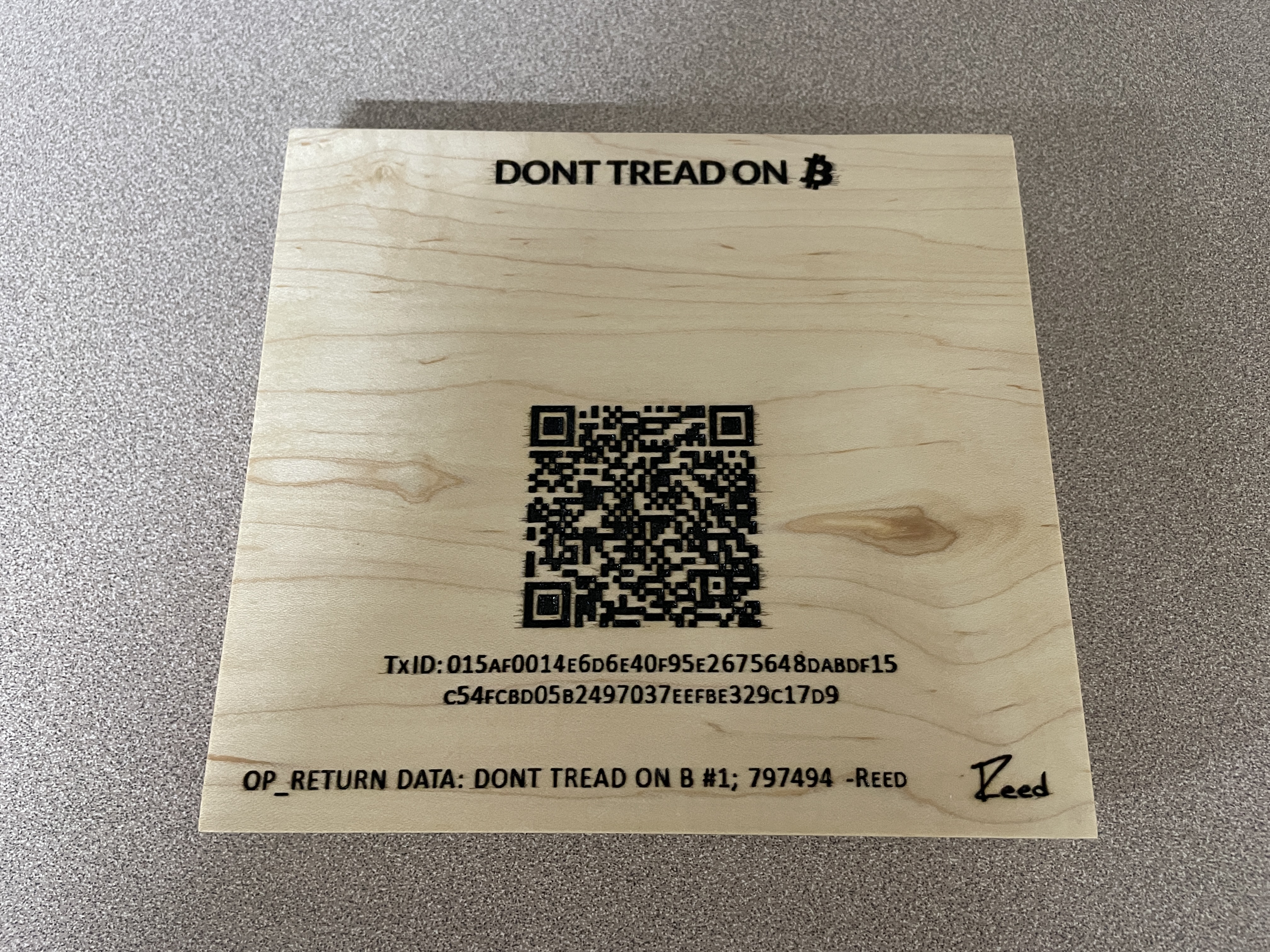 This is a numbered and signed piece that is engraved into a 8.25" X 6" solid piece of 3/4" maple with a satin finish. It's number is signed and verified via a unique OP_RETURN (<83 bytes) with 21 sats burned (verifiable via the QR code on the back). Price includes shipping within the US.
