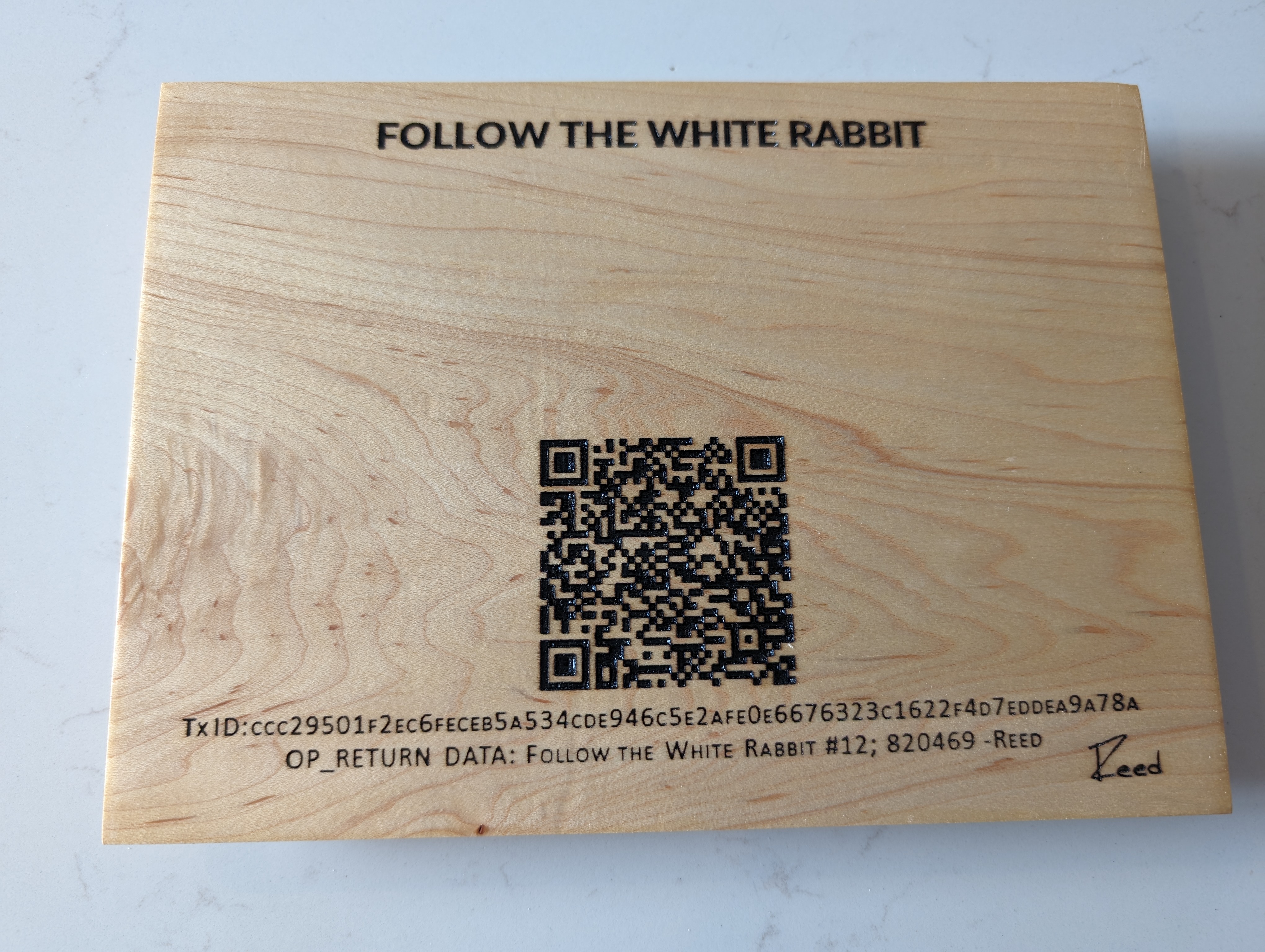 This is a numbered and signed piece that is engraved into a 8.25" X 6" solid piece of 3/4" maple with a satin finish. It's number is signed and verified via a unique OP_RETURN (<83 bytes) with 21 sats burned (verifiable via the QR code on the back). Price includes shipping within the US.
