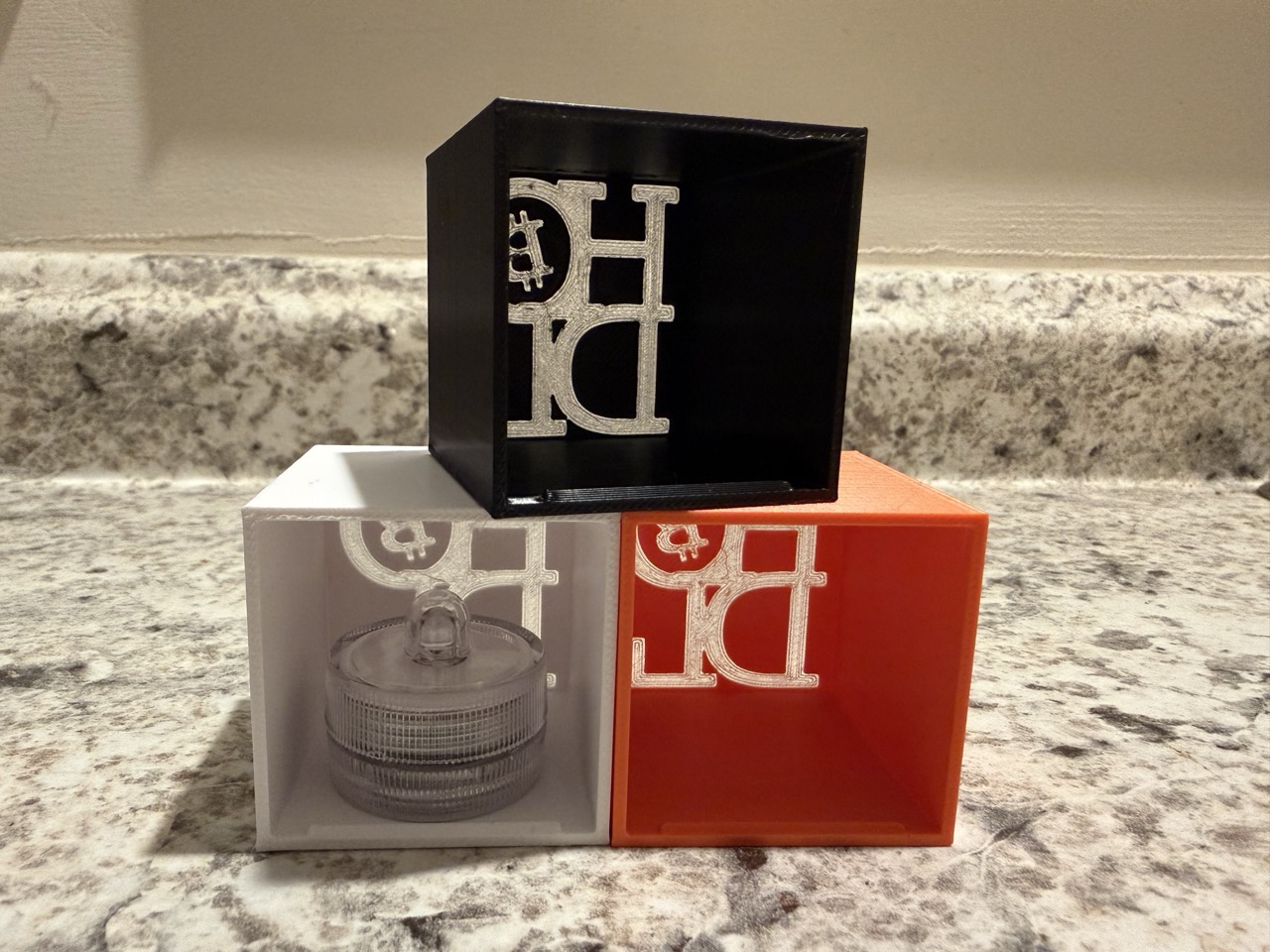 1.5 in x 1.5 in x 1.5 in. Comes in orange, white and black. Lit by an LED tea light, powered by 2x CR2032 coin batteries. Twist to power on and off.